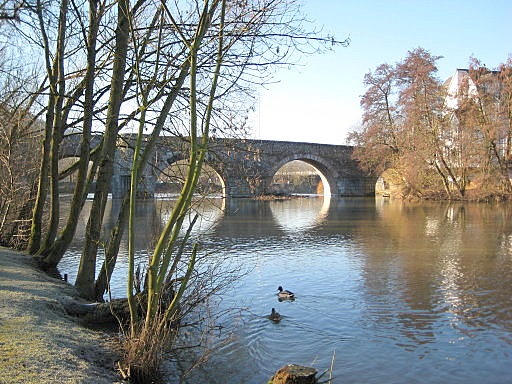Ein wunderschöner, sonniger Morgen. Die Hospitalkirche und auch die Alte Lahnbrücke spiegeln sich in der Lahn.